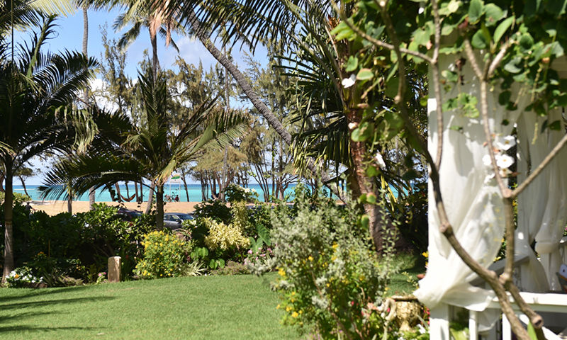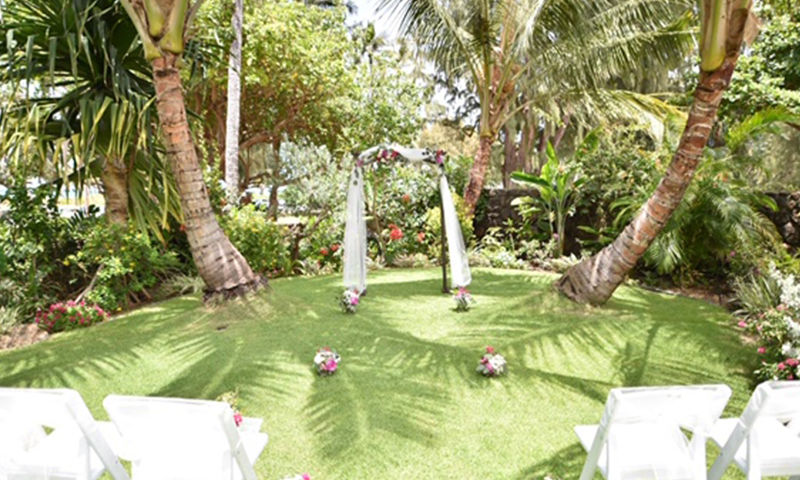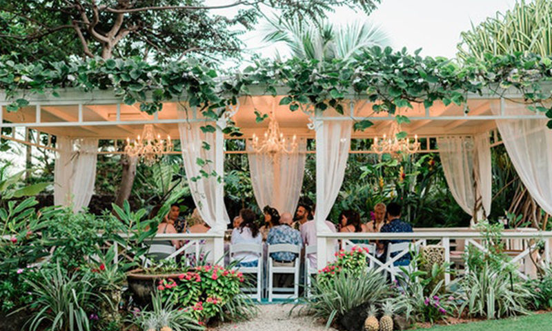 イギリスでデザイナーをしていたオーナーのシェリーさんがデザインしたハイセンスで美しいガーデンで、カイルアビーチの波の音とウクレレミュージックをバックにトロピカルなハワイアンウェディングはローカルのカップルにも人気です。