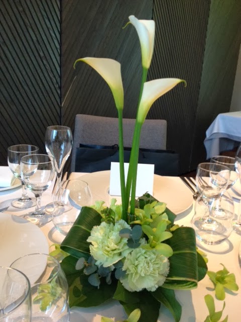 | グリーンのお花にカラーを挿して伸びやかなイメージにしたテーブルフラワー |
